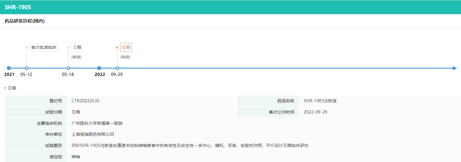除慢性阻塞性肺疾病外,SHR-1905于2021年5月获得国家药品监督管理局批准开展用于哮喘的临床试验,2023年5月获批开展慢性鼻窦炎伴鼻息肉适应症的临床试验。
