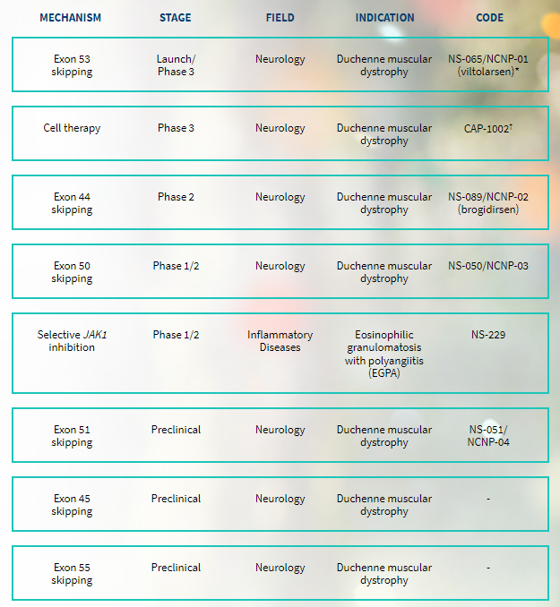 NS Pharma是日本新药株式会社Nippon Shinyaku的全资子公司,专注于研发治疗DMD药物。目前有8个管线,其中有7个用于治疗DMD。研发速度最快的是viltolarsen,已在日本获得批准上市,在美国已被有条件批准用于可跳过外显子53的DMD患者。