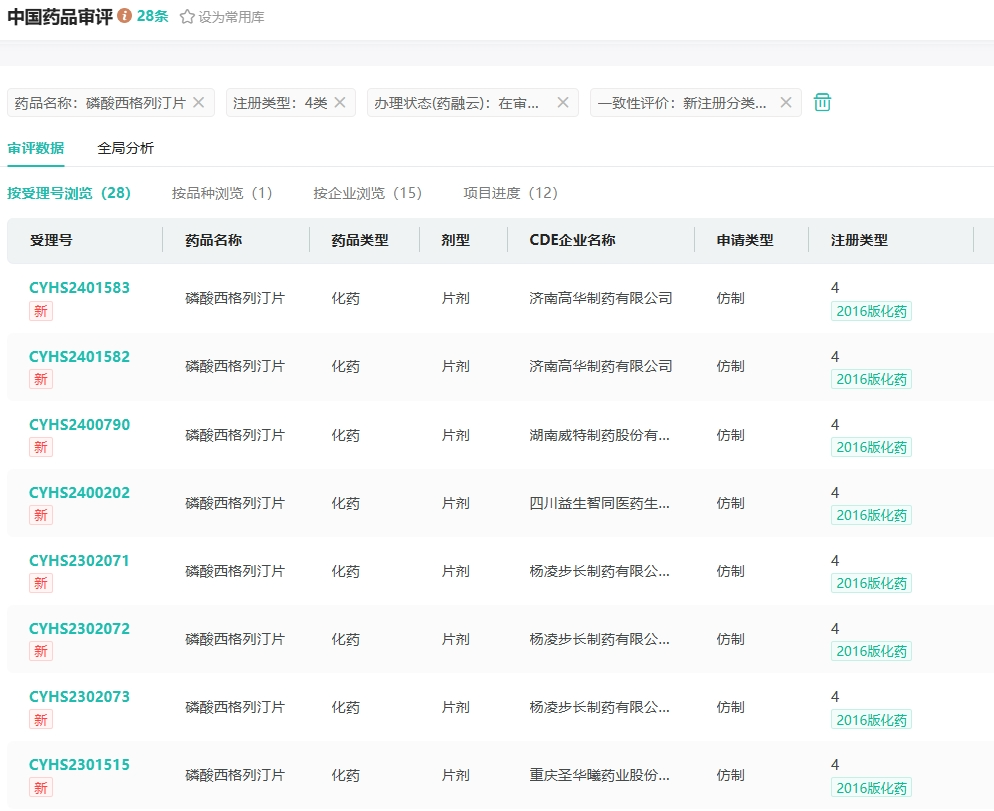 在专利保护期内,不少企业已经通过开发不同晶型来绕开原研专利,如正大天晴等公司已有相关药品上市销售。其他企业受到专利限制,制剂并未形成销售,但关于该药品的市场布局早已竞争白热化。据药融云数据统计,目前磷酸西格列汀片有山东新时代药业、江西施美药业、重庆圣华曦药业、湖南威特制药等超10家药企提交了4类注册仿制申请,均在审评审批中。