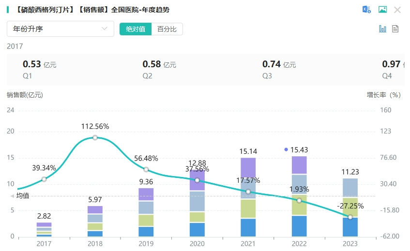 作为全球畅销药物,磷酸西格列汀自2006年获美国FDA批准生产以来,其年销售额一度达到40.86亿美元,近年来也稳定在30-40亿美元的水平。据药融云数据统计,磷酸西格列汀片在2022年全国院内销售额近16亿元,同比增长达1.93%,2023年(截止Q3)在全国院内销售额超11亿元,其中默沙东占据主要市场份额,达99.14%;正大天晴占据0.86%,相较于2022年,市场份额有所提升。
