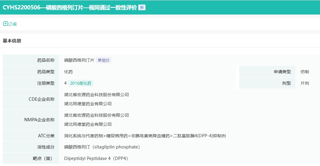近期,据NMPA官网公示,湖北省宏源药业科技的4类仿制药磷酸西格列汀片获批并视同通过一致性评价。据药融云数据库显示,磷酸西格列汀片在2022年全国院内销售额近16亿元。