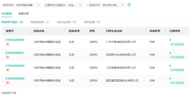 在仿制药布局方面,注射用唑来膦酸浓溶液有江苏迪赛诺制药、广州市联瑞制药、岳阳新华达制药、国药集团国瑞药业4家药企提交了4类仿制药审评,均在审评审批中。