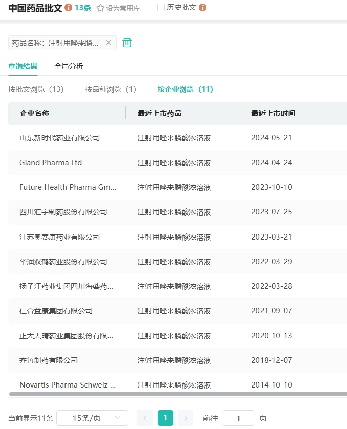 据药融云数据库显示,目前注射用唑来膦酸浓溶液已有2家进口企业和8家国内药企获得生产批文。