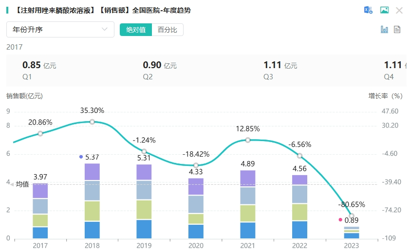 注射用唑来膦酸浓溶液是一种抑制骨吸收药物。与标准抗肿瘤药物治疗合用,可用于治疗实体肿瘤骨转移患者和多发性骨髓瘤患者的骨骼损害,也可用于治疗恶性肿瘤引起的高钙血症(HCM)。据药融云数据库显示,注射用唑来膦酸浓溶液在2022年全国院内市场销售额达4.56亿元。