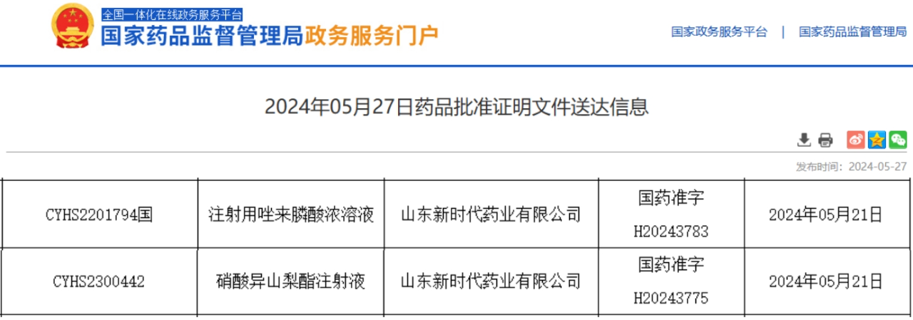 近日,据NMPA官网公示,山东新时代药业的注射用唑来膦酸浓溶液和硝酸异山梨酯注射液获批并过评。据药融云数据统计,今年(截止5月30日)山东新时代药业已有10个品种过评。