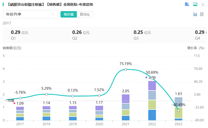 硝酸异山梨酯注射液是一种硝酸类血管扩张剂,作为心血管疾病临床常用药物,具有起效迅速、疗效稳定且不良反应可控等优点。据药融云数据库显示,硝酸异山梨酯注射液在2022年全国院内市场销售额超3亿元,同比增长达50.69%。