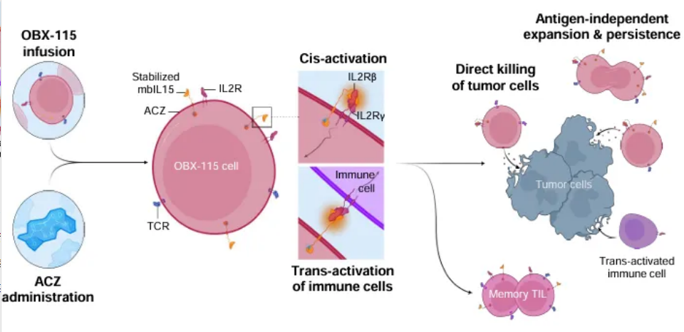 OBX-115是一种新型的工程化TIL疗法,其独特之处在于TIL能够表达细胞膜上受调节的白介素-15(IL-15)蛋白,这意味着患者在接受OBX-115治疗时,无需同时接受高剂量的白介素-2(IL-2)治疗,从而降低了潜在的治疗毒性。