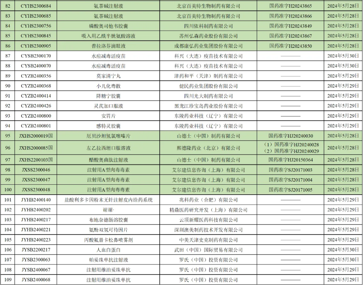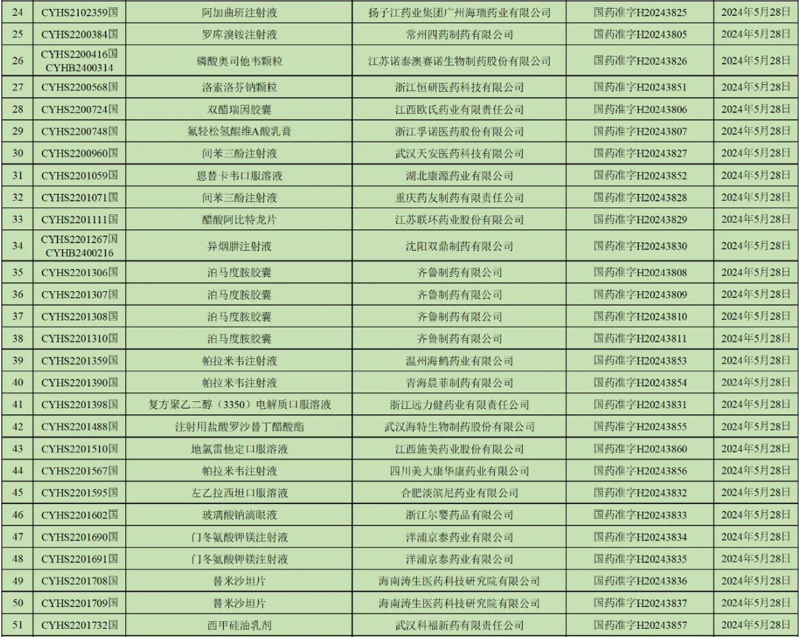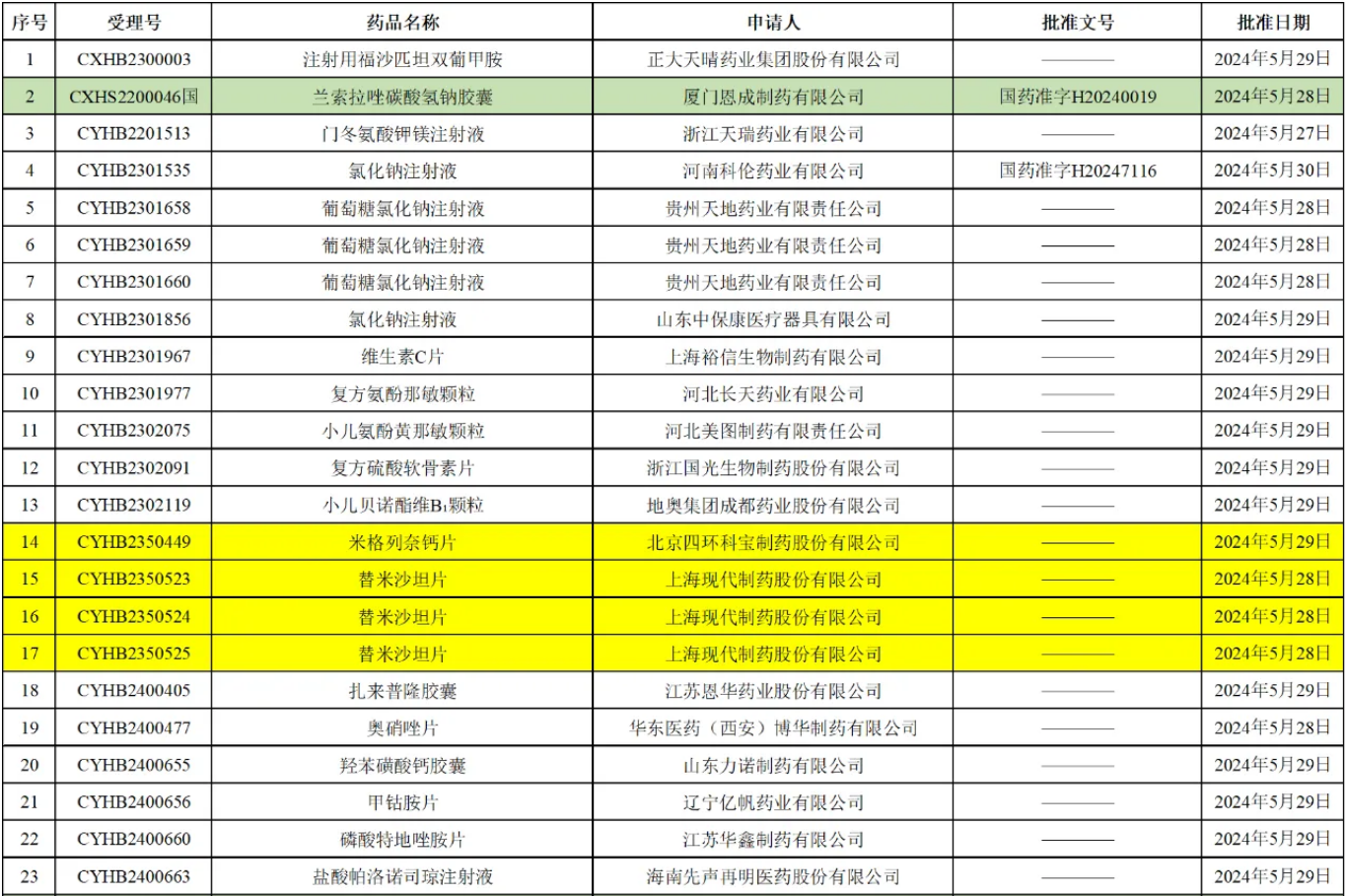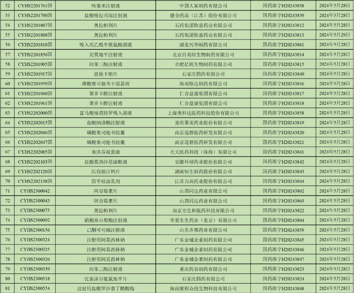 除上述品种外还有,扬子江药业集团广州海瑞药业的阿加曲班注射液;江苏联环药业的醋酸阿比特龙片;四川美大康华康药业的帕拉米韦注射液;石药集团欧意药业的奥拉帕利片;广东金城金素制药的注射用阿莫西林钠等大批品种获批。