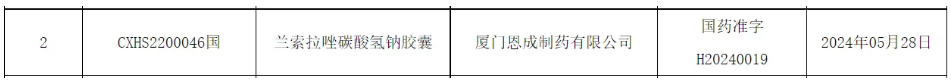 厦门恩成制药的2.2类新药兰索拉唑碳酸氢钠胶囊获批上市。此前,兰索拉唑碳酸氢钠胶囊为上海信谊万象药业的独家品种。