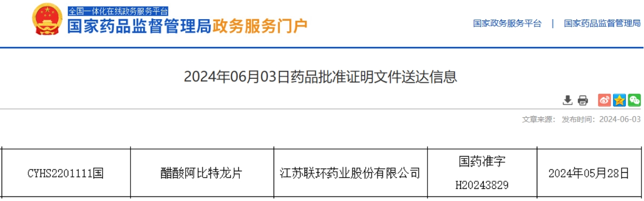 6月3日,据NMPA官网公示,江苏联环药业的醋酸阿比特龙片获批上市并视同过评。据药融云数据统计,今年江苏联环药业已有3个品种过评。