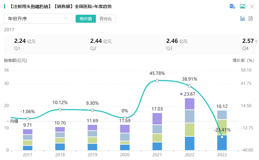 注射用头孢噻肟钠适用于敏感细菌所致的肺炎及其他下呼吸道感染、尿路感染、脑膜炎、败血症、腹腔感染、盆腔感染、皮肤软组织感染、生殖道感染、骨和关节感染等。据药融云数据库显示,注射用头孢噻肟钠在2022年全国院内市场销售额超23亿元,同比增长达23.67%。