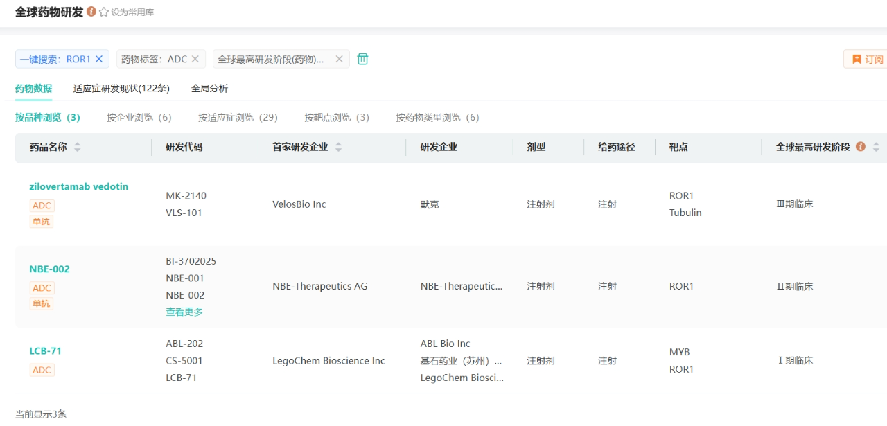 全球3款进入临床阶段 ROR1 ADC