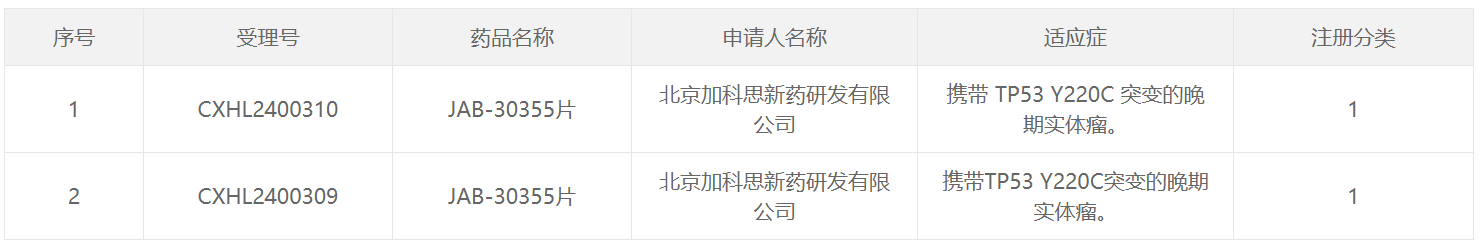 6月4日,据CDE官网,加科思JAB-30355获批临床,拟用于携带TP53 Y220C突变的晚期实体瘤。该产品目前正在美国进行针对晚期实体瘤患者的1/2a期临床研究。