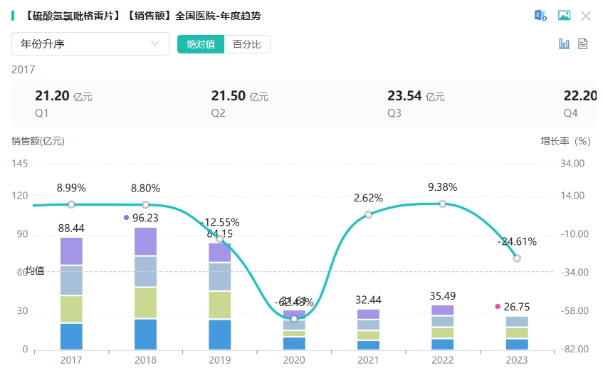 硫酸氢氯吡格雷片是抗血栓形成药市场的明星产品,用于预防和治疗因血小板高聚集状态引起的心、脑及其它动脉的循环障碍疾病。据药融云数据库显示,硫酸氢氯吡格雷片在2022年全国院内市场销售额超35亿元,同比增长达9.38%。