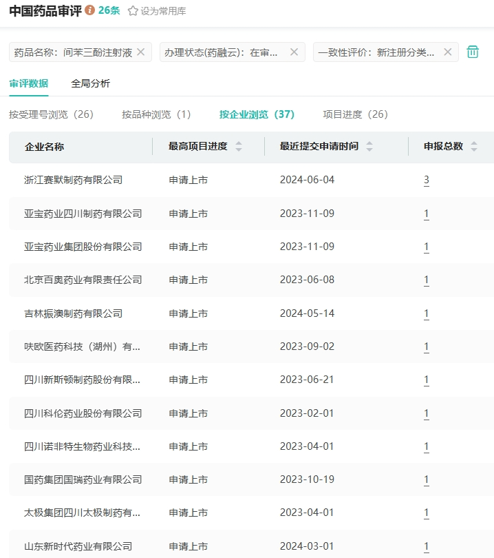 目前,间苯三酚注射液有28家企业拥有生产批文,其中重庆药友制药、江苏万高药业、成都倍特药业、仁合益康集团等25家药企过评。