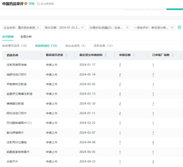 除硫酸氢氯吡格雷片,今年(截止6月7日)重庆药友制药还提交了注射用美罗培南、瑞舒伐他汀钙片、盐酸伊立替康注射液等11个品种的仿制申请,均在审评审批中。