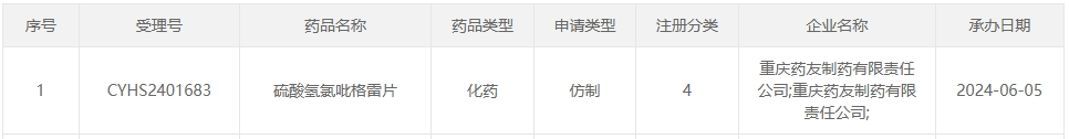 6月3日,据NMPA官网公示,重庆药友制药的间苯三酚注射液以仿制4类报产获批并视同过评。近日,该公司提交的4类仿制药硫酸氢氯吡格雷片获CDE受理。