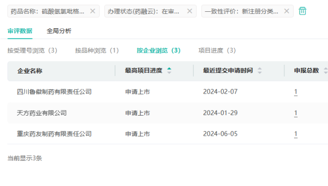 除重庆药友制药,硫酸氢氯吡格雷片还有四川鲁徽制药、天方药业2家药企提交了仿制申请,均在审评审批中。