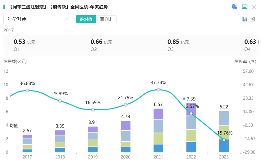 间苯三酚注射液原研Laboratoire L. Lafon(后被Teva收购),1993年于法国上市,商品名Spasfon。用于治疗消化道和胆道功能障碍引起的急性痉挛性疼痛;治疗急性痉挛性尿道、膀胱、肾绞痛;治疗妇科痉挛性疼痛。据药融云数据库显示,间苯三酚注射液在2022年全国院内市场销售额超7亿元,同比增长达12.57%。