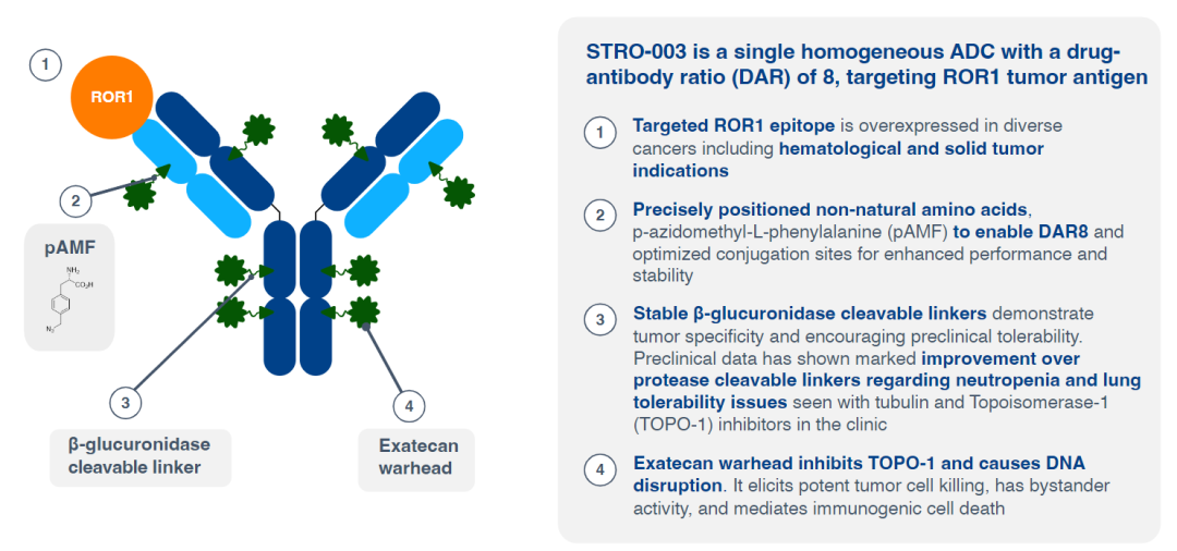 这是Ipsen首次重仓ADC资产,STRO-003是一款下一代ROR1(受体酪氨酸激酶样孤儿受体1,receptor tyrosine kinase-like orphan receptor 1)靶向ADC新药。该ADC采用exatecan(依喜替康)为有效载荷,β-葡糖醛酸糖苷酶(β-glucuronidase)可裂解连接子。DAR(药物抗体比率)值为8。