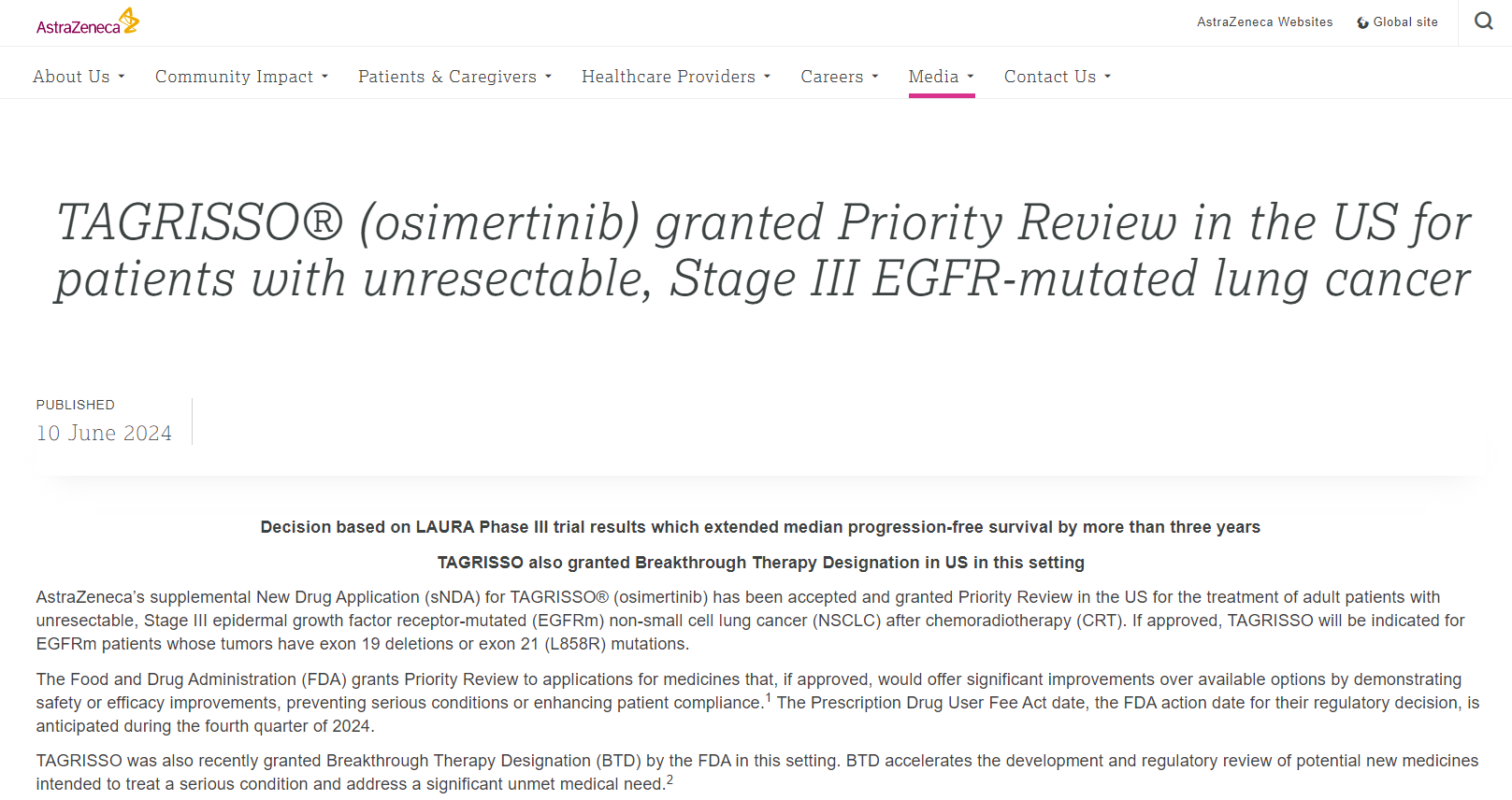 如果此适应症获得批准,TAGRISSO将适用于携带 19 号外显子缺失(19del)或 21 号外显子(L858R)突变的EGFRm患者。TAGRISSO最近还获得了FDA的突破性疗法认定(BTD)。