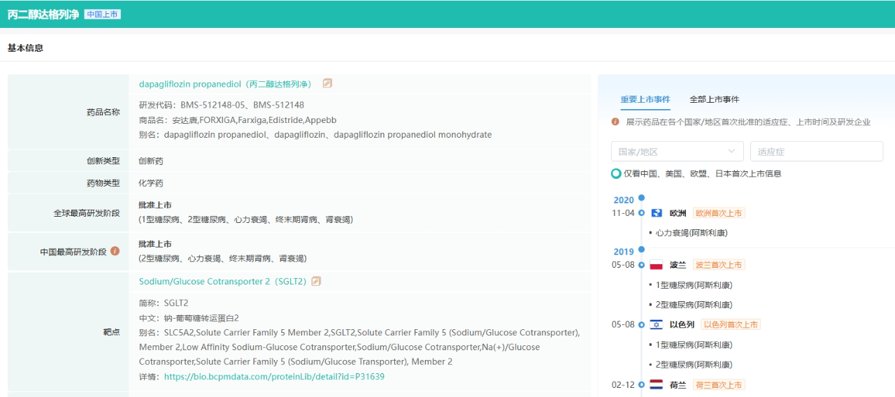 截至2024年6月,达格列净已在126个国家和地区获批,作为饮食调节和运动的辅助措施用于改善成人T2D患者的血糖控制。此外,它还在全球超过100个国家和地区获批用于治疗心力衰竭(包括射血分数降低型心力衰竭和射血分数保留型心力衰竭)和慢性肾病(CKD)成人患者。