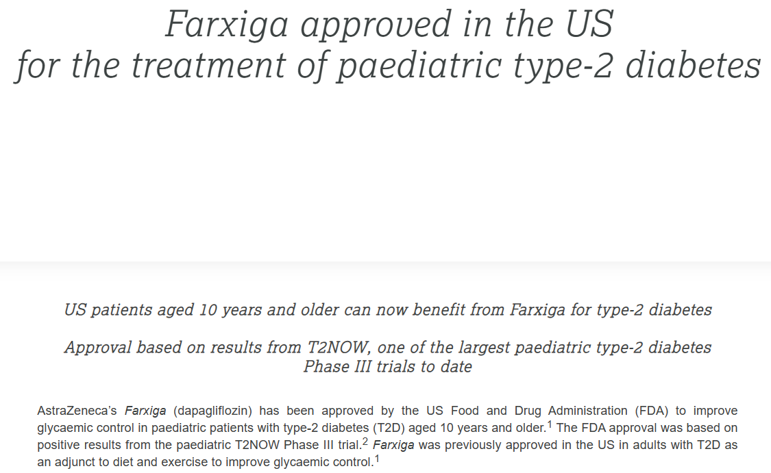 6月12日,阿斯利康(AstraZeneca)公布,Farxiga(达格列净)已获得美国FDA批准,用于改善10岁及以上2型糖尿病(T2D)儿童患者的血糖控制。此次FDA批准基于3期儿科临床试验T2NOW的积极结果。Farxiga此前已在美国获批用于治疗成人T2D患者,作为饮食调节和运动的辅助措施来改善血糖控制。