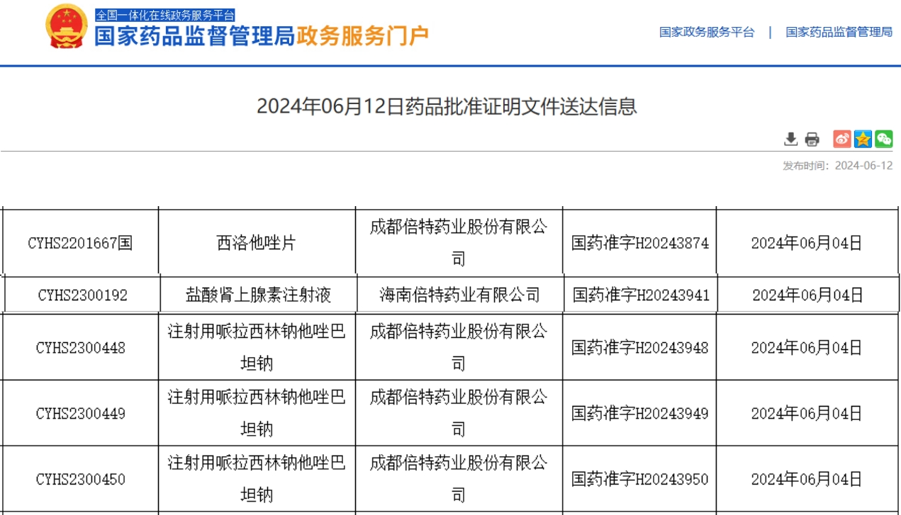 6月12日,据NMPA官网公示,倍特药业的西洛他唑片、盐酸肾上腺素注射液、注射用哌拉西林钠他唑巴坦钠3大品种同日获批。据药融云数据库显示,今年倍特药业(含子公司)有14个品种获批并过评。