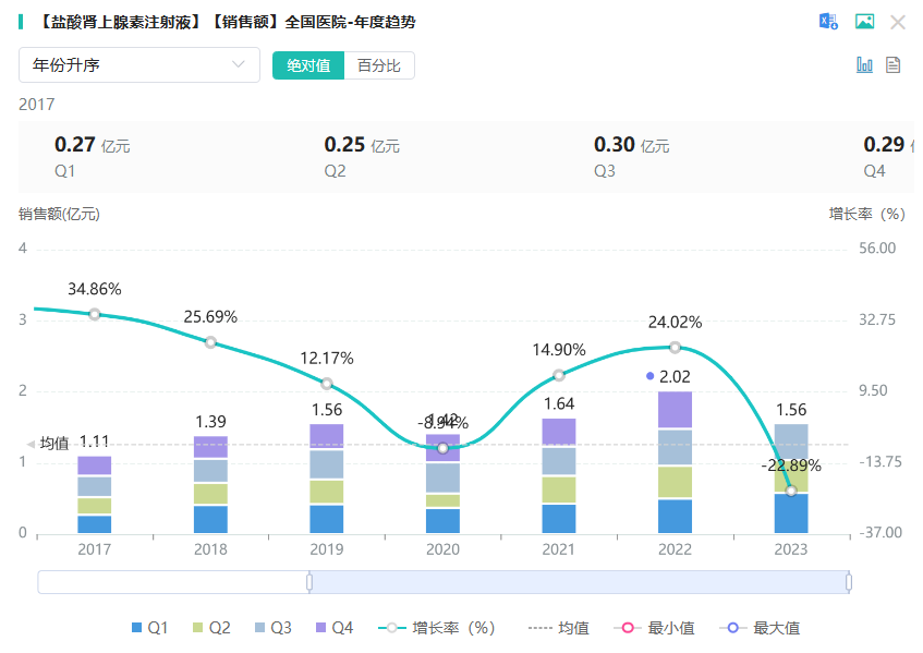 盐酸肾上腺素注射液主要适用于因支气管痉挛所致严重呼吸困难,可迅速缓解药物等引起的过敏性休克,亦可用于延长浸润麻醉用药的作用时间,是各种原因引起的心脏骤停进行心肺复苏的主要抢救用药。据药融云数据库显示,盐酸肾上腺素注射液在2022年全国院内销售额达2.02亿元,同比增长达24.02%。