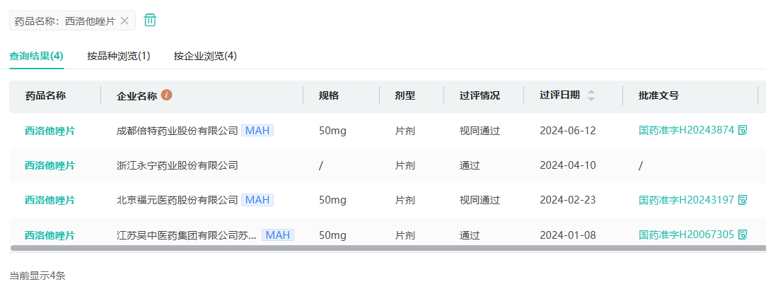 目前,西洛他唑片在国内有23家企业拥有生产批文,此前仅江苏吴中医药集团、北京福元医药、浙江永宁药业3家企业过评,本次倍特药业是第4家过评该品种的药企。