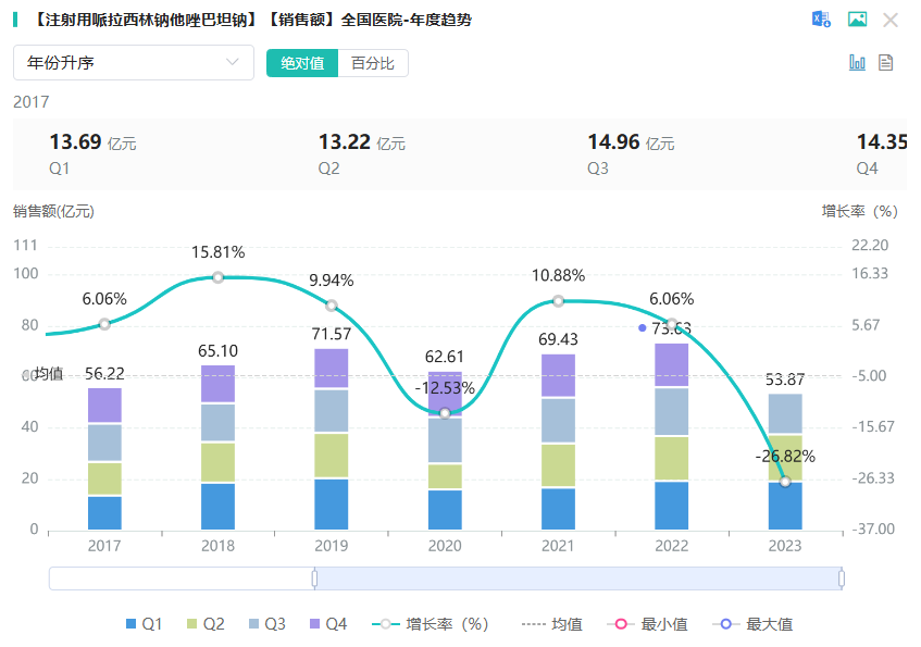 据药融云数据库显示,注射用哌拉西林钠他唑巴坦钠在2022年全国院内市场销售额超73亿元,同比增长达6.06% 。