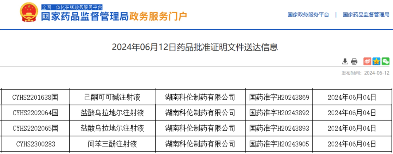 6月12日,据NMPA官网公示,湖南科伦制药的盐酸乌拉地尔注射液、己酮可可碱注射液、间苯三酚注射液3大品种同日获批。据药融云数据库显示,3大品种在2022年全国院内市场销售额均超7亿元。