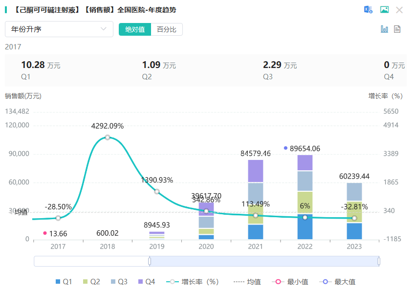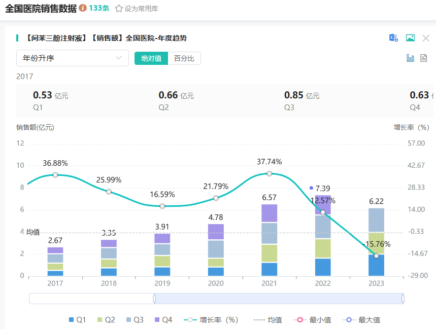 间苯三酚注射液原研Laboratoire L. Lafon(后被Teva收购),1993年于法国上市,商品名Spasfon。用于治疗消化道和胆道功能障碍引起的急性痉挛性疼痛;治疗急性痉挛性尿道、膀胱、肾绞痛;治疗妇科痉挛性疼痛。据药融云数据库显示,间苯三酚注射液在2022年全国院内市场销售额超7亿元,同比增长达12.57%。