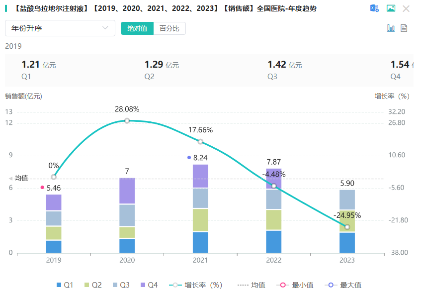 乌拉地尔是由武田研发的一种选择性α1受体阻滞剂,具有外周和中枢双重降压作用。盐酸乌拉地尔注射液是高血压急症的一线治疗药物,在临床中被广泛应用于高血压危象、外科手术降压及预防血压峰值等各种降压治疗。据药融云数据库显示,盐酸乌拉地尔注射液在2022年全国院内市场销售额超7亿元。