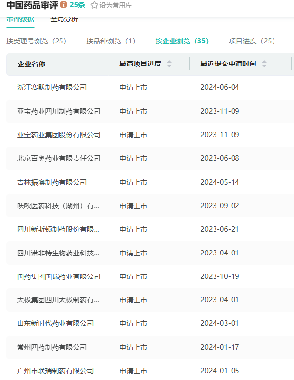 目前该品种有29家药企获批,其中湖南科伦制药、重庆药友制药、成都倍特药业等26家药企过评。此外还有35家药企提交了仿制上市申请,均在审评审批中。