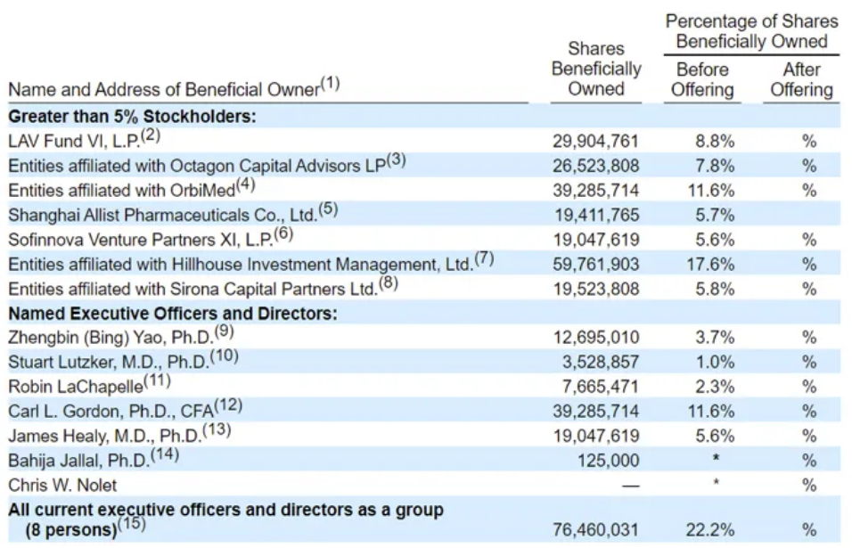 2024年1月5日,Arrivent Biopharma向美国纳斯达克递交IPO申请。招股书显示:公司B轮投后估值达3.57亿美元。上市前高瓴资本为目前第一大股东,艾力斯,礼来亚洲基金,中国的红杉资本等等持股。