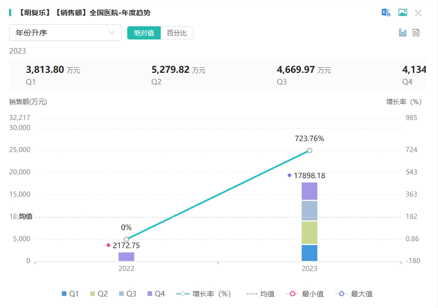 据药融云数据库显示,明复乐在2023年(截止Q3)全国院内市场销售额超1亿元,同比增长达724%。作为首个国产替奈普酶,明复乐在急性心肌梗死和急性缺血性卒中治疗领域已占据重要地位。面对未来可能面临的仿制药竞争,东吴证券预测,明复乐的销售峰值将达到20亿元,市场前景广阔。