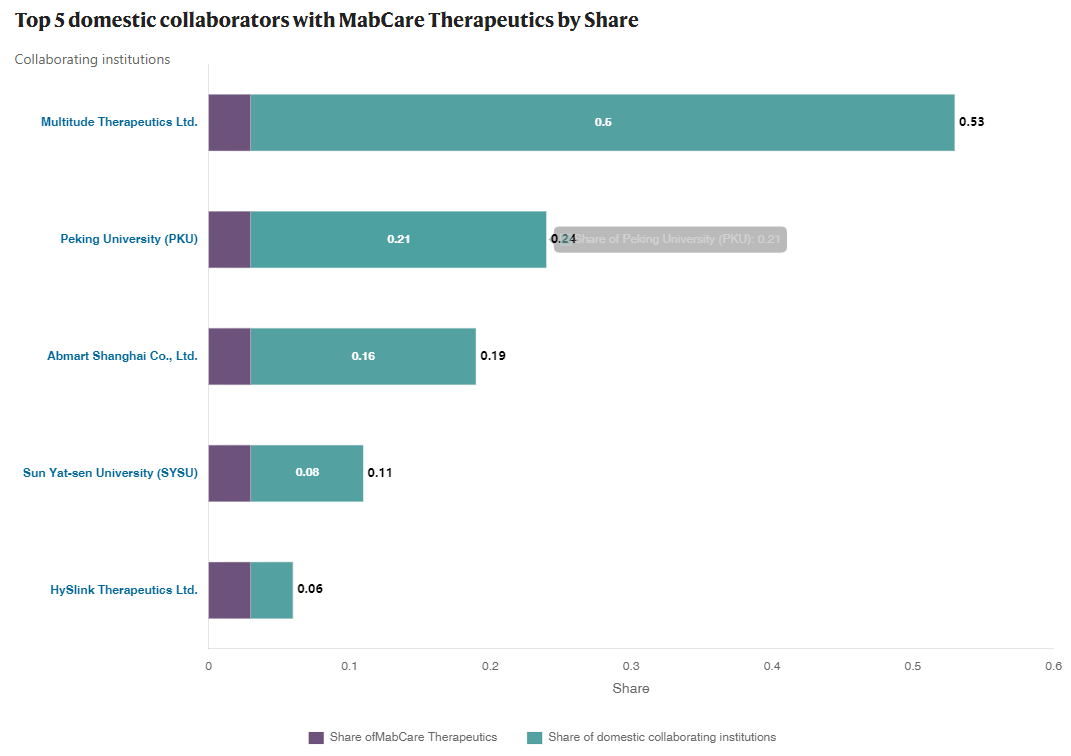 据《Nature index》显示,MabCare Therapeutics国内前5名合作伙伴分别有:Multitude Therapeutice(普众发现)、Peking University(北京大学)、Abmart Shanghai Co., Ltd.(艾比玛特医药科技(上海)有限公司)、Sun Yat-sen Univereity(中山大学)、HySlink Therapeutice(汇连生物),其中普众发现合作占比最高。