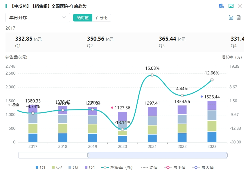 近日,据以岭药业公告称,公司的中药1类新药柴黄利胆胶囊上市申请获得国家药监局受理,用于慢性胆囊炎肝胆湿热、胃失和降证。据药融云数据库显示,2023年全国院内市场中成药的销售额超1500亿元。