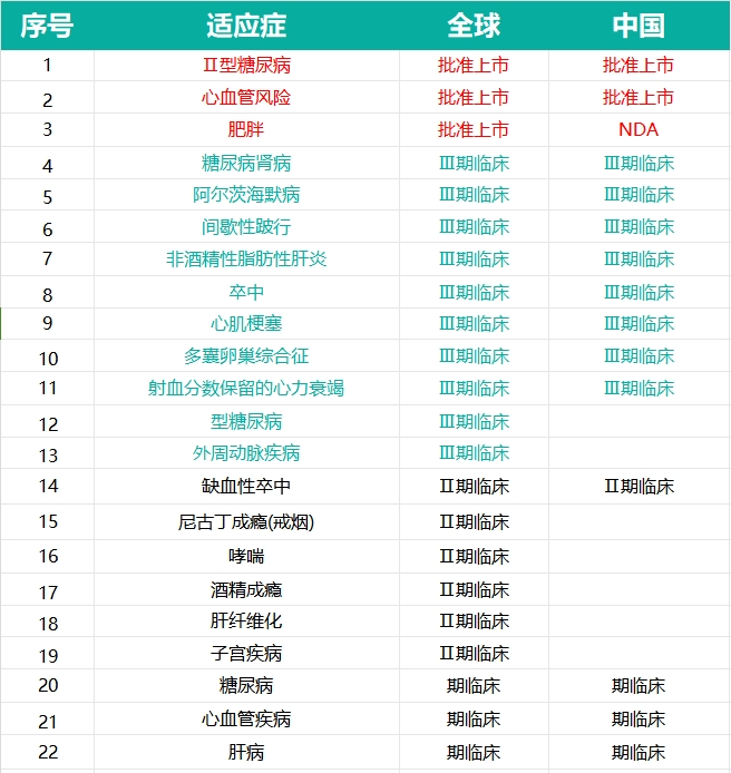 诺和诺德公司在全球范围内对司美格鲁肽进行了22种适应症的布局,涉及NASH、阿尔茨海默病、心血管疾病等领域,共400个临床试验。在中国,正在进行14种适应症的研究,共计50个临床试验。