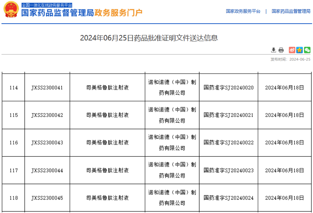 6月25日,国家药品监督管理局(NMPA)批准了诺和诺德公司研发生产的诺和盈(用于长期体重管理的司美格鲁肽注射液)在中国的上市申请。这是全球首个且目前唯一用于长期体重管理的胰高糖素样肽-1受体激动剂(GLP-1)周制剂,能够实现平均17%(16.8公斤)的体重降幅。