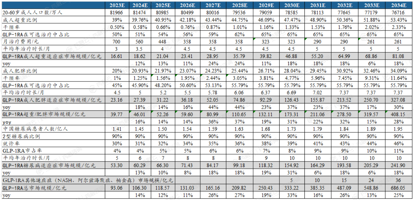 随着司美格鲁肽等GLP-1药物的崛起,国内外对GLP-1市场的关注度和投入不断增加。据预测,到2030年,国内GLP-1市场规模有望突破330亿美元。目前,国内GLP-1市 场正在快速扩容。主要适应症为超重/肥胖和2型糖尿病,一类新药,改良药和类似药齐发力。据预算2030年超重/肥胖适应症的市场规模有望达到173亿元,2型糖尿病市场规模有望达到155亿元。NASH,阿尔兹海默症和帕金森等适应症多数还在临床早期阶段,预计2030起逐步贡献收入。国内外众多药企都在争相研发GLP-1类药物,以抢占这一巨大的市场。在中国,已有超过110款GLP-1类新药进入临床阶段,涉及恒瑞医药、信立泰、甘李药业、华东医药等多家知名企业。