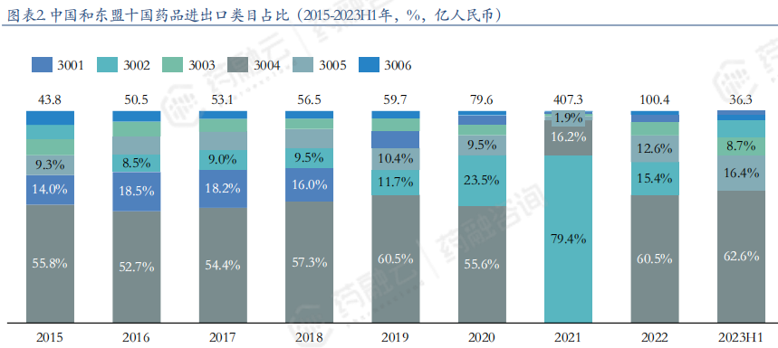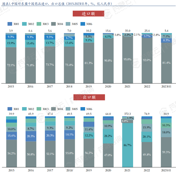 中国和东盟十国药品进出口类目占比(2015-2023H1年,%,亿人民币)