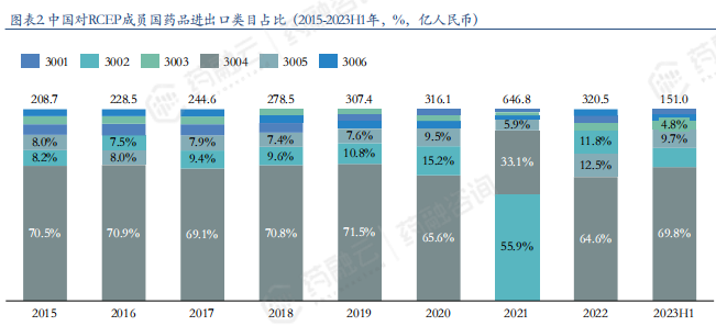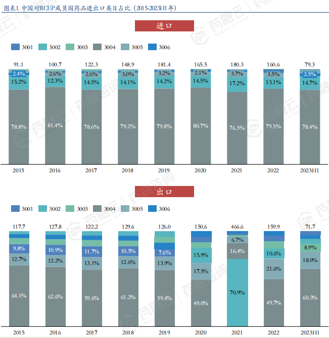 中国对RCEP成员国药品进出口类目占比(2015-2023H1年)