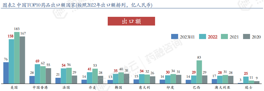 中国TOP10药品出口额国家(按照2022年出口额排列,亿人民币)
