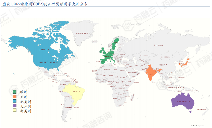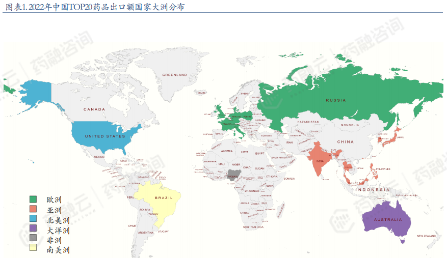 2022年中国TOP20药品出口额国家大洲分布