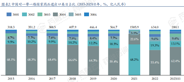 从出口数据来看,中国出口药品类型相对丰富,虽然3004类药品仍然占比第一的类型,但是3002等生物类制品产品近些年比重逐步提高,2022占比22%,3005医药辅料类产品也是我国出口到一带一路国家的重点产品,占比16%左右。