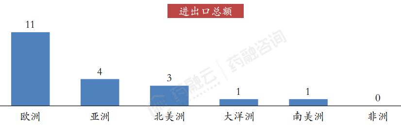 我国药品进口额前20国家大洲分布及金额:2022年我国前20位进口贸易伙伴分别来自除非洲,南美洲外的4个大洲,其中欧洲占比最高,共有13个国家进入前20,占比超50%,达到65%。