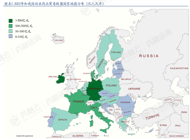 2022年我国和欧盟国家药品外贸金额及地图分布