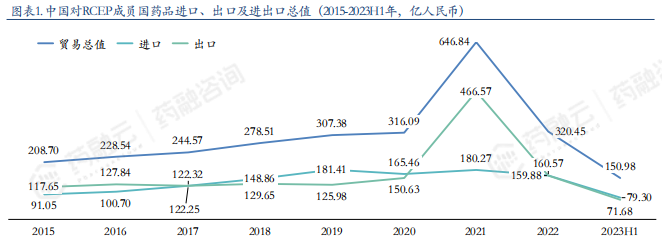 中国对RCEP成员国药品进口、出口及进出口总值(2015-2023H1年,亿人民币)